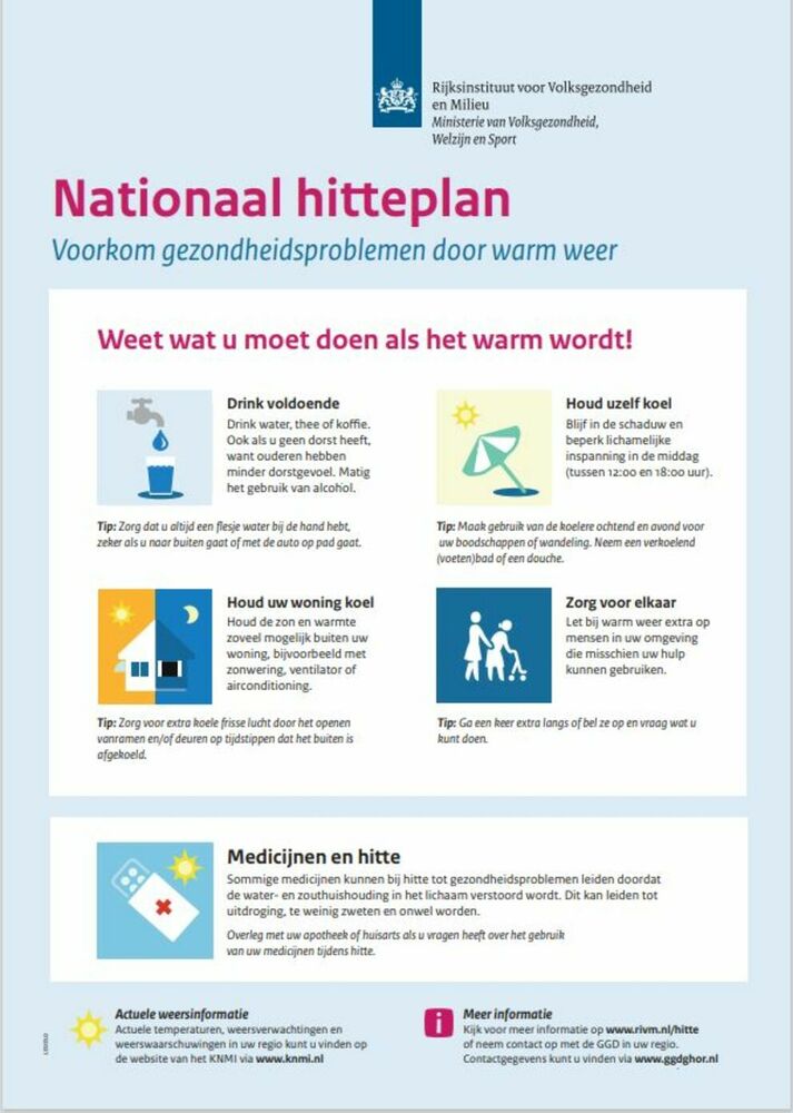 Voorkomen is beter dan genezen. En daarbij helpt een groene tuin of groen balkon. Planten nemen warmte uit de lucht, terwijl stenen de warmte juist vast houden. Een groene tuin is wel 5 tot 7 graden koeler dan een volledig versteende tuin. Gelukkig kun je hier zelf ook iets aan doen. Haal tegels uit de tuin en kies voor groen. Planten als leliegras, sedum, hortensia’s, lavendel en vlinderstruiken hebben weinig onderhoud nodig. Heeft u geen tuin, maar wel een balkon? Kies dan voor bloempotten en kruidenrekjes om de warmte op te nemen.